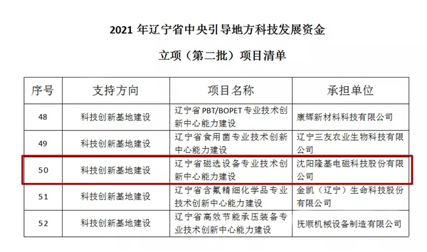 近日,隆基電磁“遼寧省磁選設(shè)備專業(yè)技術(shù)創(chuàng)新中心能力建設(shè)”項(xiàng)目成功入選“遼寧省2021年中央引導(dǎo)地方科技發(fā)展資金立項(xiàng)(第二批)項(xiàng)目”。 2021-09-06