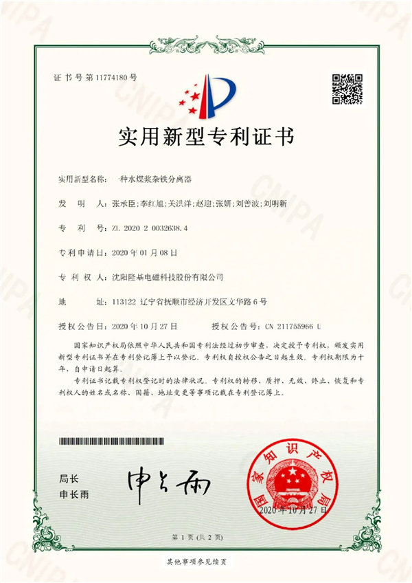 隆基水煤漿除鐵器從產品性能到自動操控,都凝聚了隆基的創新智慧,展現了隆基的品牌領跑實力,產品已獲得國家知識產權局頒發的實用新型專利證書。