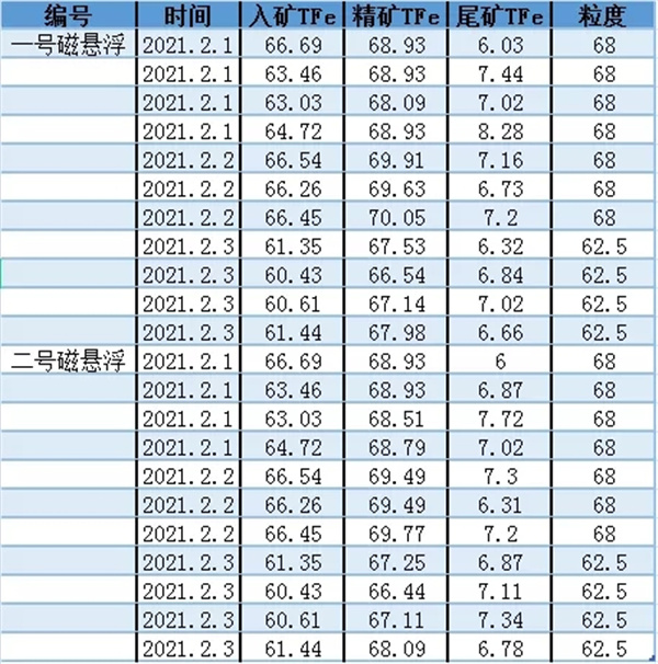 2021年3月10日后,進(jìn)行第二階段放粗實(shí)驗(yàn),磨礦粒度由-200目,占65%,放粗到-200目,占52%,精礦品位穩(wěn)定在66.5%以上,入磨量從170t/h提高到270t/h。