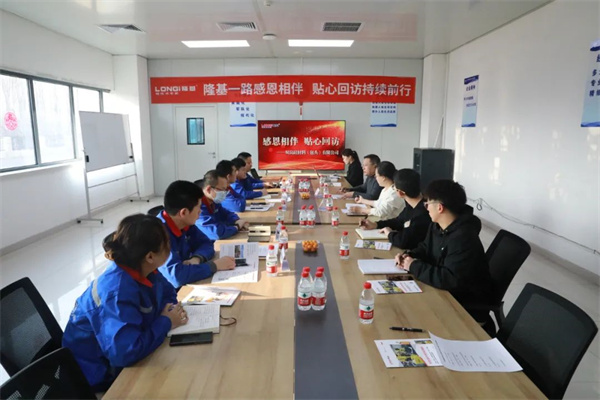 2月15日,活動來到本次回訪的第一站——雙良硅材料(包頭)有限公司,隆基銷售總監徐家林、光伏半導體行業發展部經理趙威及相關技術人員組成的回訪團隊上門拜訪,與客戶面對面深入溝通,雙良公司相關負責人出席交流會,雙方針對項目運營情況、設備日常維護、工藝優化及升級等方面進行了交流。