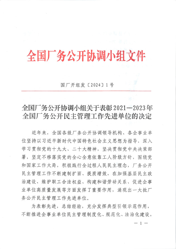 近日,全國廠務(wù)公開協(xié)調(diào)小組下發(fā)《關(guān)于表彰2021—2023年全國廠務(wù)公開民主管理工作先進(jìn)單位的決定》。沈陽隆基電磁科技股份有限公司榮獲2021—2023年全國廠務(wù)公開民主管理先進(jìn)單位。