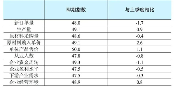2023年一季度有色金屬企業(yè)信心指數(shù)為49.8,比上季度上升1.4個(gè)點(diǎn)。信心指數(shù)在連續(xù)回落兩個(gè)季度后再次出現(xiàn)回升,接近臨界點(diǎn)50。另外,本期即期指數(shù)為48.6,較上期上升0.1個(gè)點(diǎn);預(yù)期指數(shù)為50.6,較上期上升2.4個(gè)點(diǎn),具體情況詳見圖1和圖2。