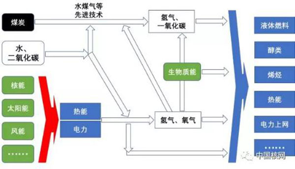 為了讓可再生能源大量發(fā)電上網(wǎng),我們還需要更先進的技術(shù),以核能為基荷的復(fù)合能源是目前比較有競爭力的選擇之一。如下圖所示,靈活集成多種能源形式作為輸入,以核能為基荷,并根據(jù)所在地區(qū)的資源稟賦,一方面可以結(jié)合采用一種或多種可再生能源,滿足電力、供熱、海水淡化、制氫等需求,提高新能源利用效率。另一方面,還可以結(jié)合化石能源,綜合采用水煤氣、清潔煤等技術(shù),清潔高效的利用煤炭等自然資源,減少碳排放和環(huán)境污染,而且除了發(fā)電還能生產(chǎn)化工原料,實現(xiàn)能源的梯級利用,能滿足多方面的社會需求。最重要的是,通過管理多種能源引入帶來的動態(tài)變化和不確定性,減少對電網(wǎng)的沖擊,實現(xiàn)最大化利用可再生能源。
