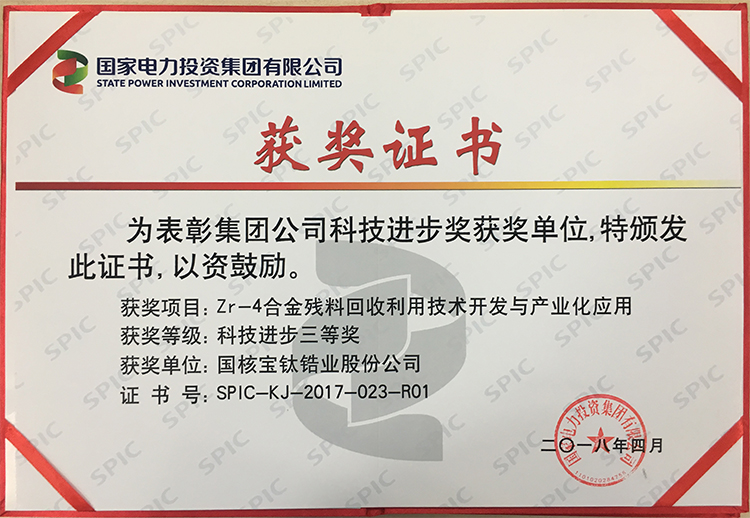 國核寶鈦鋯業股份公司《Zr-4合金殘料回收技術開發與產業化應用》項目獲國家電力投資集團科技進步三等獎