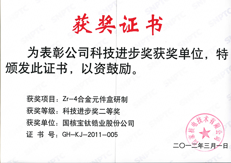 國(guó)核寶鈦鋯業(yè)股份公司《Zr-4合金元件盒研制》獲2011年度國(guó)家核電技術(shù)公司科技進(jìn)步二等獎(jiǎng)