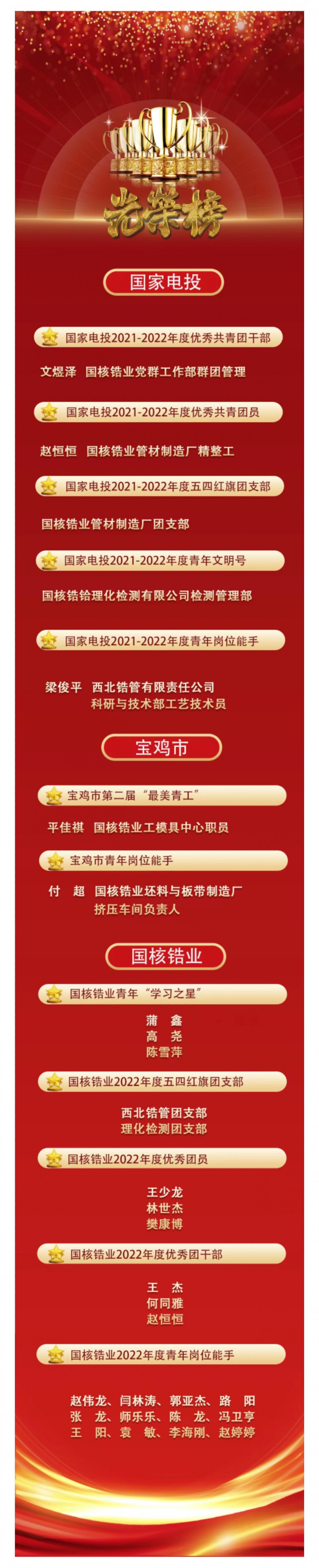 今年五四青年節,國核鋯業共有2個集體和3名個人獲得集團公司級榮譽;2名個人獲得寶雞市級榮譽;21名個人和2個集體獲得公司級榮譽。讓我們向榜樣學習、向青春致敬。